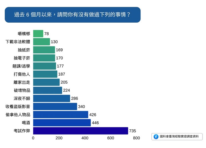 #臺灣數位世代青少年的成長歷程追蹤研究 調查了全台國七學生(約13歲)過去六個月的偏差行為。如圖所示,考試作弊是最常見的 (735人),其次是喝酒 (446人);較少見的則是的嚼檳榔 (78人)、下載非法軟體 (130人) 等。